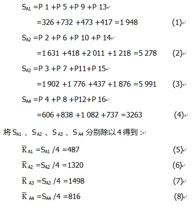 對(duì)表 3試驗(yàn)結(jié)果進(jìn)行分析 , 用 SA1 表示因素 A取水平時(shí)相應(yīng)的試驗(yàn)結(jié)果之和 , SA2 表示因素 A取第二水平時(shí)相應(yīng)的試驗(yàn)結(jié)果之和, SA3 表示因素 A取第三水平時(shí)相應(yīng)的試驗(yàn)結(jié)果之和 , SA4 表示因素 A取第四水平時(shí)相應(yīng)的試驗(yàn)結(jié)果之和 ,即: