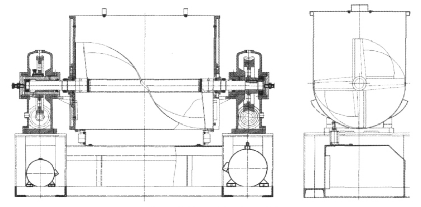 機械攪拌式混合機的儲料槽固定不動,利用安裝在槽內(nèi)的攪拌器的旋轉(zhuǎn)達到混合物料的目的,能處理附著性、凝集性強的粉體、濕潤粉體和膏狀物料,對于物性差別大的物系的混合也很適用。此類混合機裝填率高、操作面積小、占用空間小、操作方便。由于可設(shè)計成密閉式和安設(shè)夾套,所以可在非常溫常壓下工作,也可以用于反應(yīng)、制粒、干燥、涂層等復合操作中。缺點:機器的維修和清洗困難,故障發(fā)生率高,容器及攪拌機上會部分地固結(jié)粉體。其結(jié)構(gòu)如圖所示: