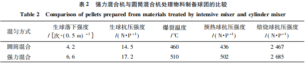 分別將圓筒混合機(jī)和強(qiáng)力混合機(jī)處理的鐵精礦用于造球、預(yù)熱和焙燒,其結(jié)果比較如下表所示: 在使用強(qiáng)力混合機(jī)進(jìn)行混合后,球團(tuán)的各項指標(biāo)均有不同程度的提高,尤其是生球強(qiáng)度,提高的效果十分顯著,主要原因是強(qiáng)力混合機(jī)使膨潤土在物料中分散得更加均勻,顆粒與顆粒之間黏結(jié)得更加緊密,從而提高了生球的落下強(qiáng)度和抗壓強(qiáng)度,預(yù)熱球及焙燒球抗壓強(qiáng)度分別提高 66、118 N/P。