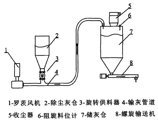 除塵系統(tǒng)手機的煙塵采用密閉管道正壓稀相輸送方式,將煙塵輸送到只求系統(tǒng)進行壓球。采用氣力輸送的優(yōu)點是減少了煙塵的二次倒運和因此產(chǎn)生的無組織排放,實現(xiàn)了煙塵的長距離密閉輸送。如下圖: